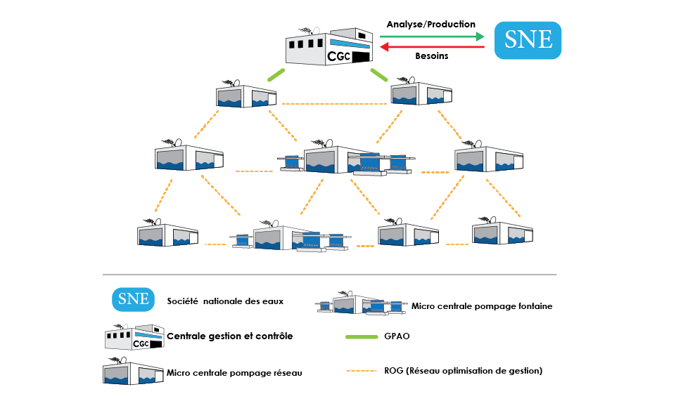 Une fois définie, nous installons autant de MCP nécessaires que l’étude le retranscrit, et les relions ensemble en GPAO à la CGC. Celle-ci gère, régularise, planifie, optimise les apports en cubage sur le réseau en fonction des demandes de la SNE, ainsi qu’en fonction des indices type, pic de consommation, coupure, intervention technique sur réseau d’adduction, développement social, industriel ….